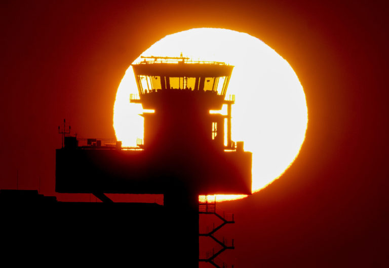 Východ slnka a letisková veža v nemeckom Frankfurte. Foto: SITA/AP.