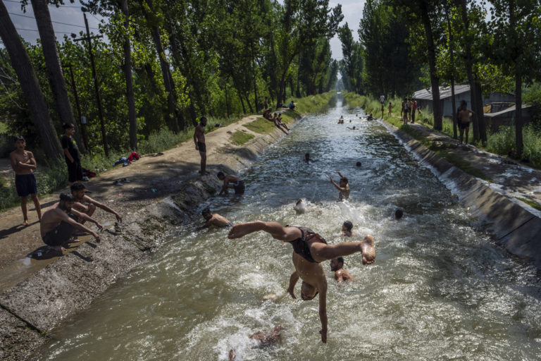 Chlapec skáče vody, aby sa ochladil počas horúceho letného dňa na okraji Srinagaru. Foto: SITA/AP.