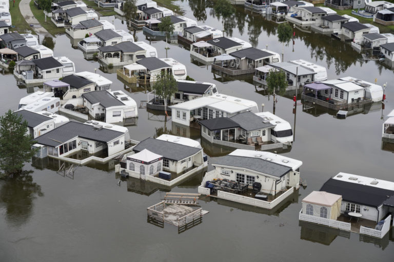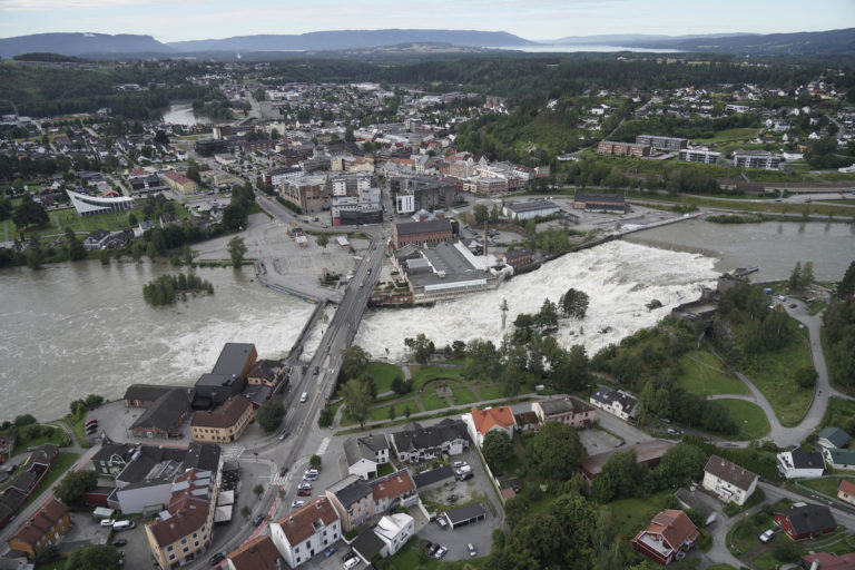 Povodne v juhovýchodnej časti Nórska po niekoľkodňových výdatných dažďoch. Foto: NTB via AP.