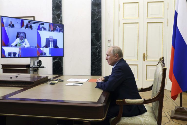 Ruský prezident vedie online rokovanie Bezpečnostnej rady. Foto: Michail Klimentjev, Sputnik, Kremlin Pool Photo via AP.
