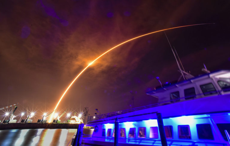 Štart rakety Falcon 9 spoločnosti SpaceX s družicami Starlink z mysu Canaveral na Floride. Foto: Malcolm Denemark/Florida Today via AP.