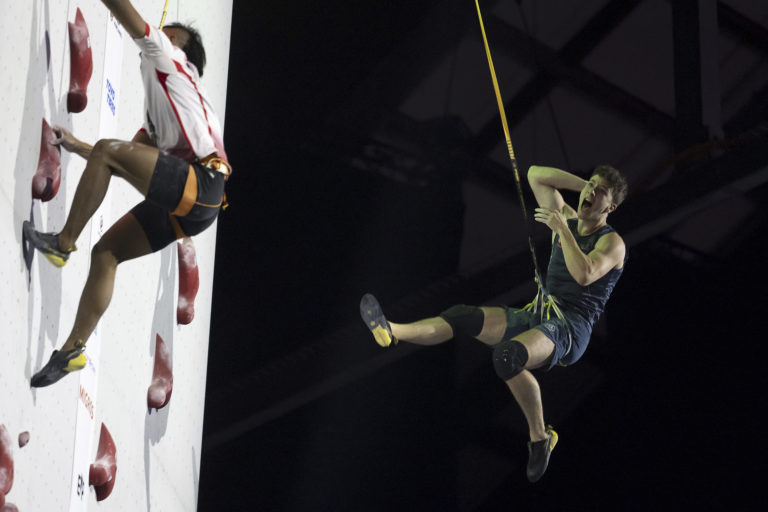 Talian Matteo Zurloni (vpravo) a indonézsky reprezentant Rahmad Adi Mulyono na majstrovstvách sveta v lezení vo švajčiarskom Berne. Foto: Anthony Anex/Keystone via AP.