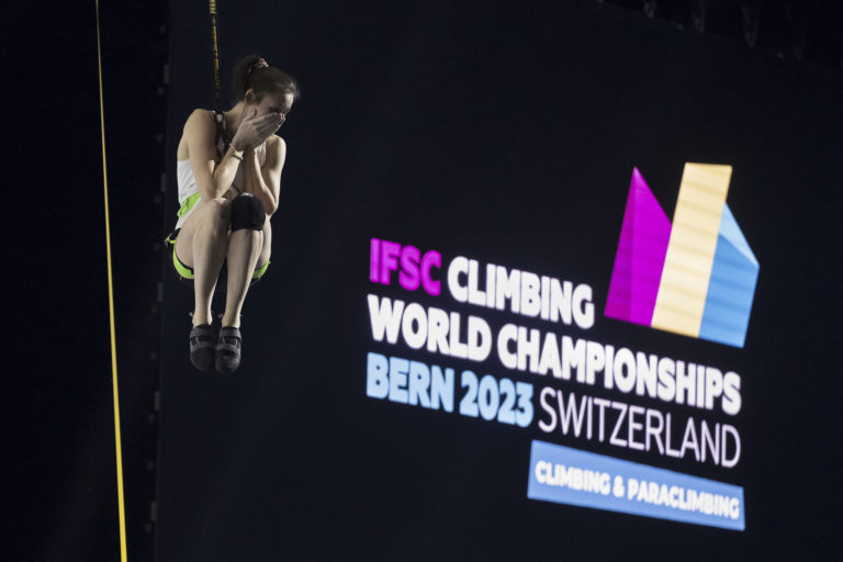 Americká reprezentantka Emma Huntová na majstrovstvách sveta v lezení vo švajčiarskom Berne. Foto: Anthony Anex/Keystone via AP.