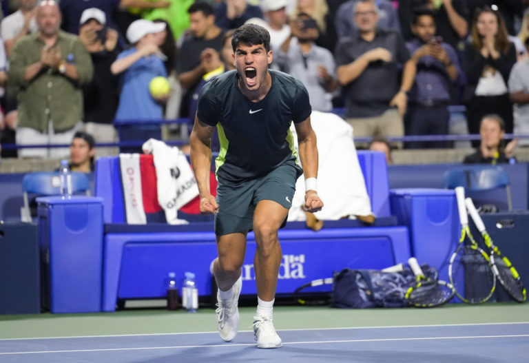 Španielsky tenista Carlos Alcaraz po osemfinálovom zápase na turnaji v Toronte, v ktorom zdolal Poliaka Huberta Hurkacza 3:6, 7:6, 7:6. Foto: Mark Blinch/The Canadian Press via AP.