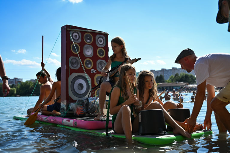 Účastníci sútaže kreatívnych plavidiel poháňaných ľudskou silou na jazere Veľký Draždiak. Bratislava, 11. august 2024. Foto: SITA