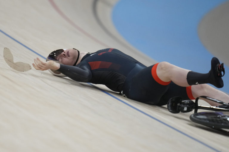 Britský cyklista Jack Carlin po páde počas disciplíny keirin v dráhovej cyklistike na Letných olympijských hrách 2024. Paríž, 11. august 2024. Foto: SITA/AP