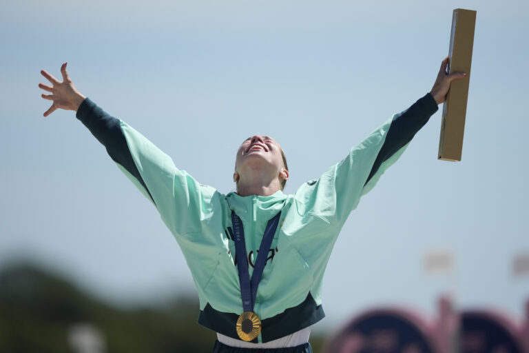 Maďarka Blanka Guzi sa raduje zo zlatej medaily v modernom päťboji na Letných olympijských hrách 2024. Versailles, 11. august 2024. Foto: SITA/AP