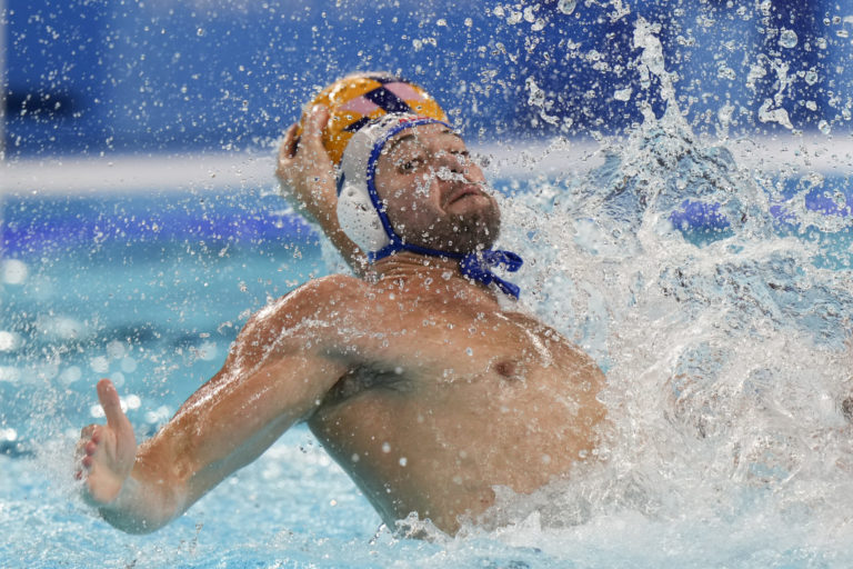 Chorvát Rino Buric sa pokúša streliť gól Srbsku počas súboja o zlatú medialu vo vodnom póle na Letných olympijských hrách 2024. Paríž, 11. august 2024. Foto: SITA/AP