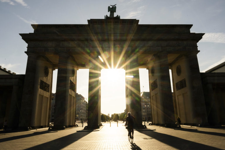 Vychádzajúce slnko za Brandenburskou bránou. Berlín, 11. august 2024. Foto: Christophe Gateau/dpa via AP