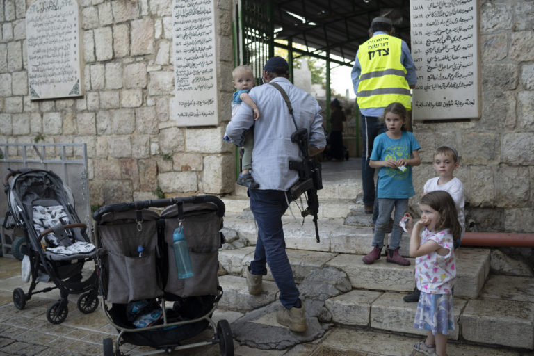 Ozbrojený Izraelčan s dieťaťom v náručí pri vchode na cintorín pred hradbami Starého mesta. Jeruzalem, 11. august 2024. Foto: SITA/AP