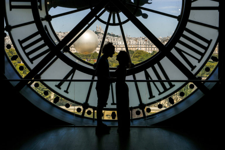 Ľudia pózujú v Musee d'Orsay na pozadí Jardin des Tuileries, kde je umiestnený olympijský oheň, v posledný deň Letných olympijských hier 2024. Paríž, 11. august 2024. Foto: SITA/AP