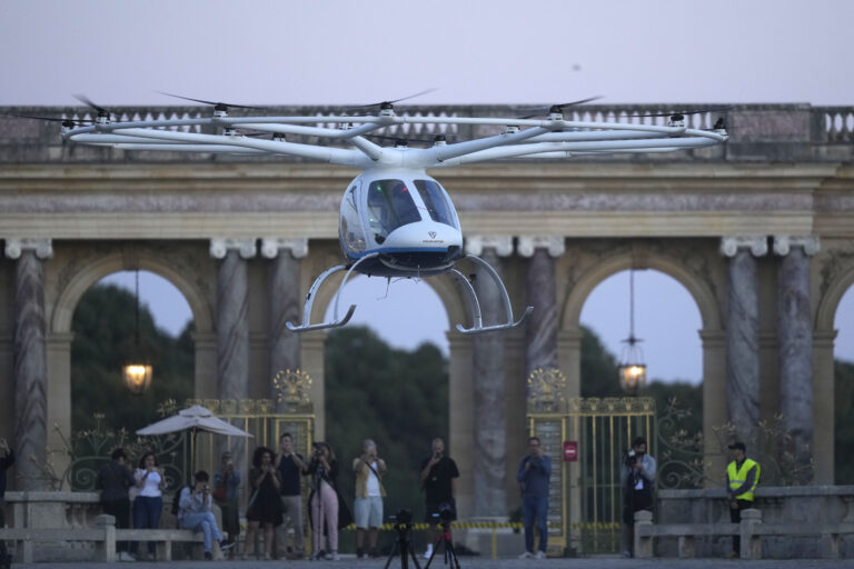 Lietajúci taxík Volocopter počas testovacieho letu. Versailles, 11. august 2024. Foto: SITA/AP