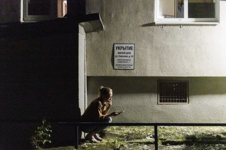 Žena so smartfónom pred vchodom do krytu po ukrajinskom ostreľovaní ruského územia. Kursk, 11. august 2024. Foto: SITA/AP