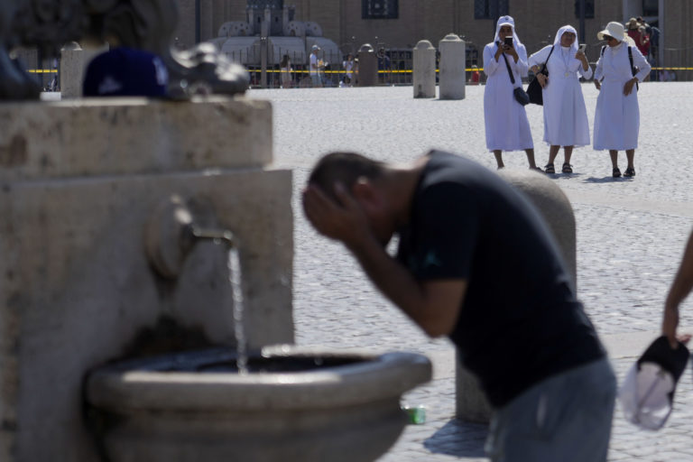 Muž sa osviežuje pri fontáne na Námestí svätého Petra počas letnej horúčavy. Vatikán, 11. august 2024. Foto: SITA/AP