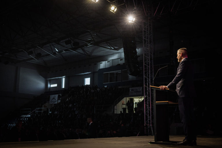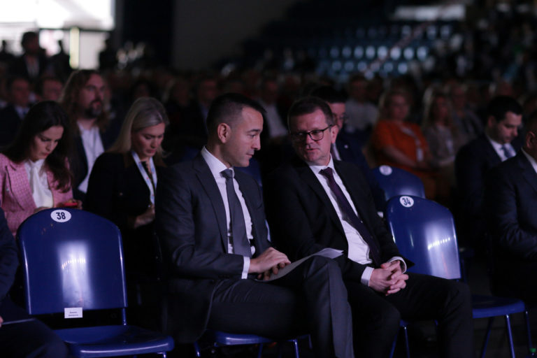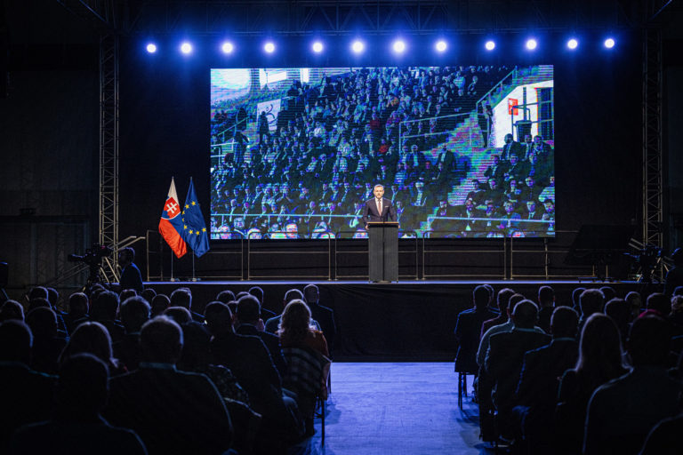 Zľava: Predseda Národnej rady SR Peter Pellegrini počas 1. pracovného kongresu Ministerstva investícií, regionálneho rozvoja a informatizácie (MIRRI) SR s komunálnymi lídrami v Aréne Poprad. Poprad, 11. december 2023. Foto: SITA/NR SR.
