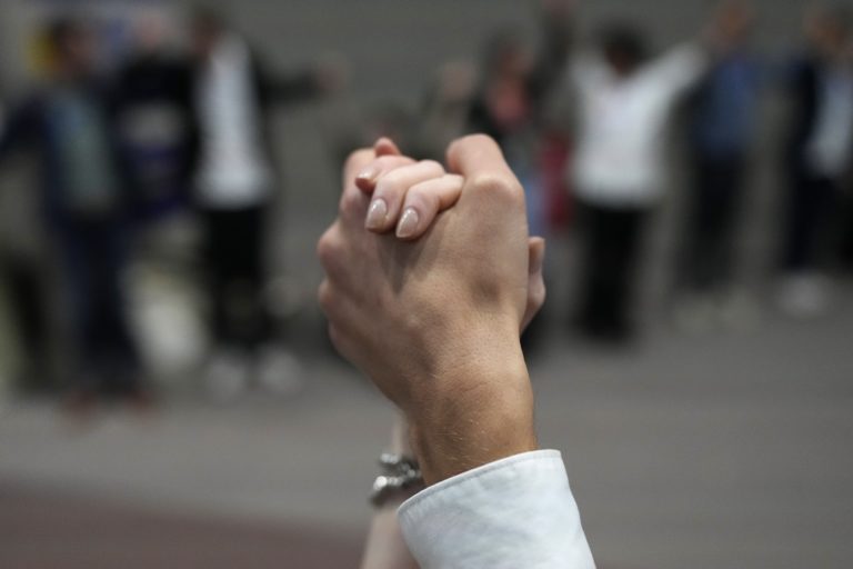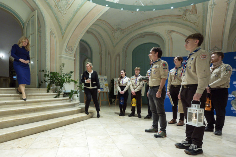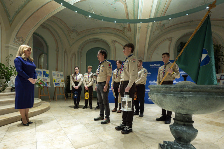 Prezidentka Zuzana Čaputová (vľavo) počas prijatia skautov a Betlehemského svetla v Prezidentskom paláci. Bratislava, 11. december 2023. Foto: SITA/Milan Illík.