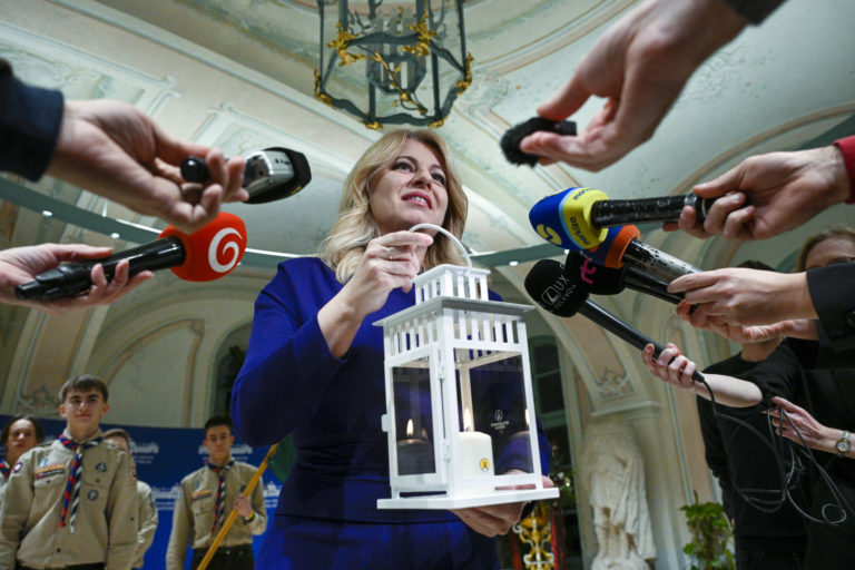 Prezidentka Zuzana Čaputová odpovedá na otázky novinárov počas prijatia skautov a Betlehemského svetla v Prezidentskom paláci. Bratislava, 11. december 2023. Foto: SITA/Milan Illík.