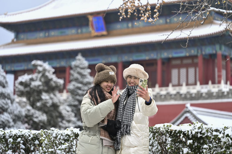 Ženy pred zasneženou bránou Shenwu v Palace Museum v Pekingu. Foto: Li Xin/Xinhua via AP.