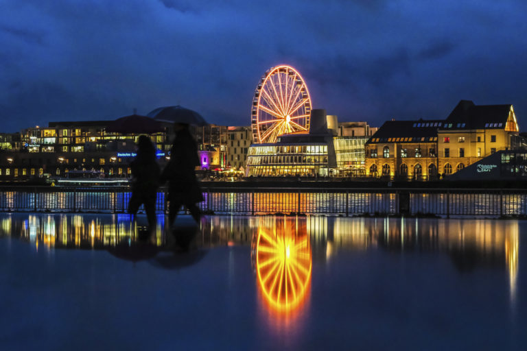 Ľudia prechádzajú okolo kolotoča odrážajúceho sa na dažďom premočenej ceste na brehu rieky Rýn v Kolíne. Foto: Oliver Berg/dpa via AP.