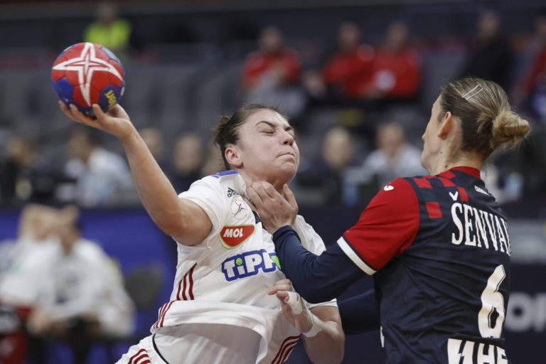 Chorvátka Sare Senvaldová v súboji s maďarskou reprezentantkou Petrou Vámosovou počas zápasu na MS v hádzanej žien v Arene Scandinavium v Göteborgu Foto: Adam Ihse/TT News Agency via AP.