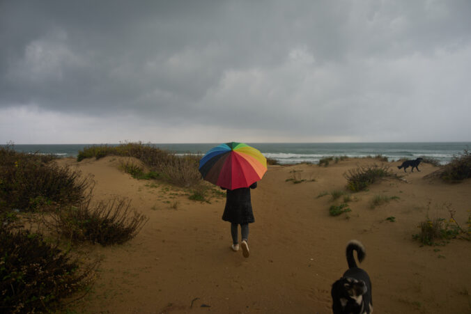 Hila Gomel sa prechádza so svojími psami smerom k Stredozemnému moru počas daždivého dňa v Hadere. Izrael, 11. decembra 2025. Foto: AP Photo/Ariel Schalit