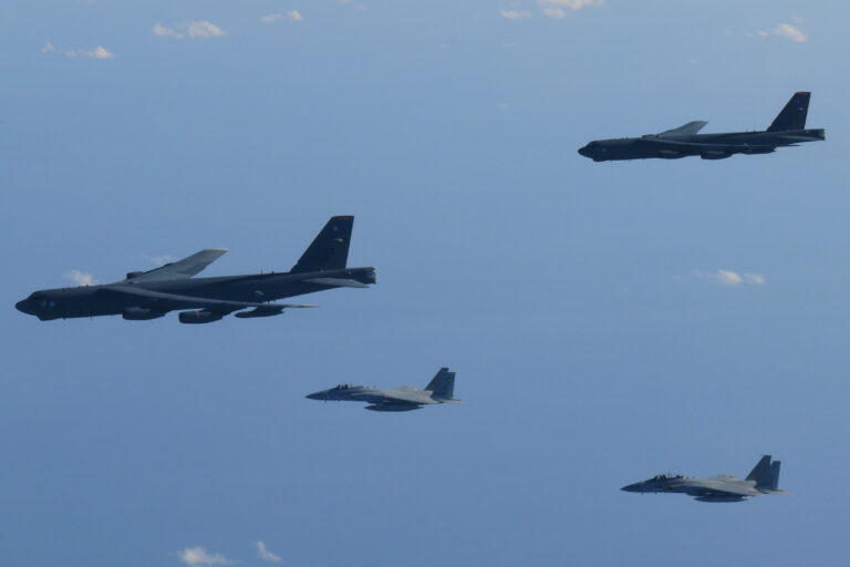 Stíhačky F-15 japonských vzdušných síl sebaobrany počas spoločného cvičenia s americkými bombardérmi B-52 v blízkosti japonského vzdušného priestoru. Japonsko, 10. december 2025. Foto: Japan's Ministry of Defense via AP