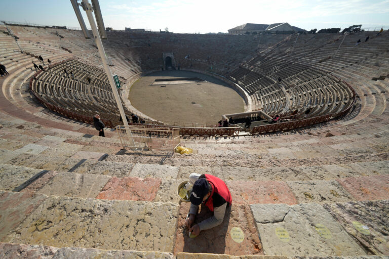 Pracovník odstraňuje nálepky s číslami sedadiel, ktoré sa používajú na označenie miest počas koncertov v Aréne vo Verone. Taliansko, 10. decembra 2025. Foto: AP Photo/Luca Bruno