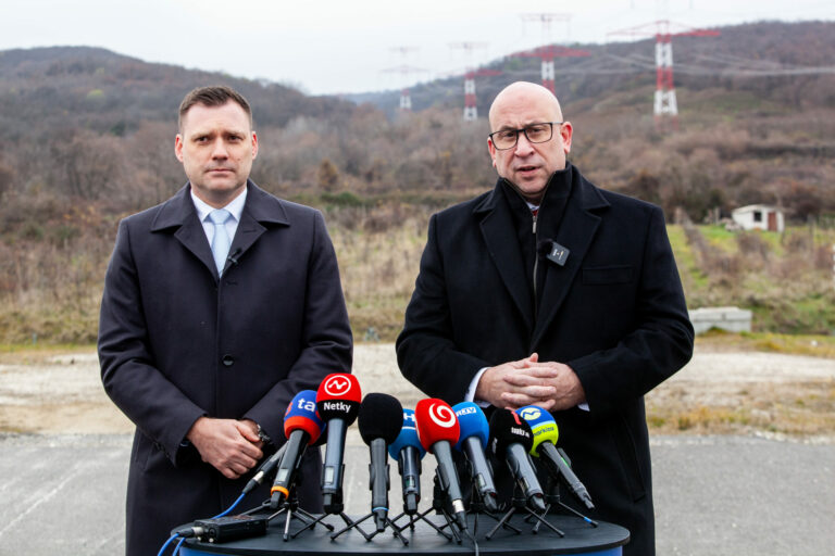 Zľava: Minister životného prostredia SR Tomáš Taraba a minister dopravy SR Jozef Ráž počas tlačovej besedy k výstavbe tunela Karpaty na ceste medzi Bratislavou a Svätým Jurom, kde by mal v budúcnosti tunel Karpaty nadväzovať na diaľnicu D4. Bratislava, 11. december 2024. Foto: SITA/Tomáš Bokor