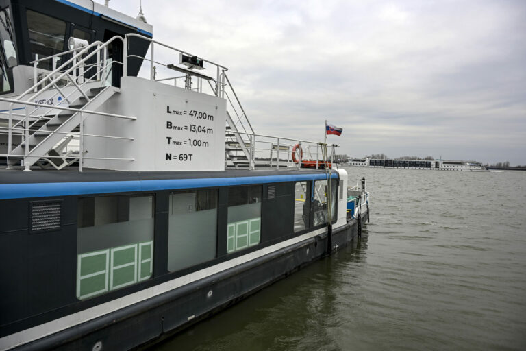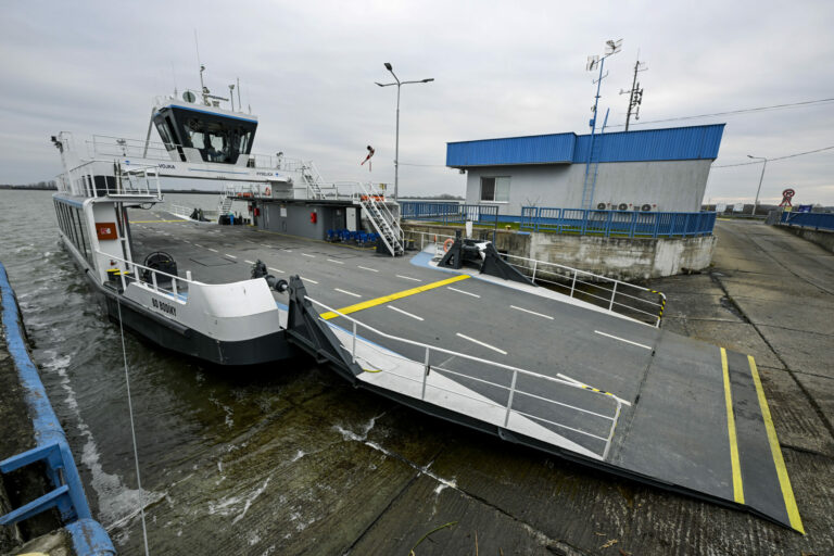 Kompa v prístave vo Vojke nad Dunajom počas obnovenej prevádzky medzi prístavom vo Vojke nad Dunajom a obcou Kyselica. Kompa dokáže naraz previezť sto osôb, 18 osobných áut a tri nákladné vozidlá s hmotnosťou do 20 ton. Pre verejnosť je jej využitie bezplatné. Vojka nad Dunajom, 11. december 2024. Foto: SITA/Milan Illík