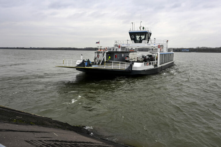 Kompa počas obnovenej prevádzky plavby medzi Vojkou nad Dunajom a obcou Kyselica. Kompa dokáže naraz previezť sto osôb, 18 osobných áut a tri nákladné vozidlá s hmotnosťou do 20 ton. Pre verejnosť je jej využitie bezplatné. Vojka nad Dunajom, 11. december 2024. Foto: SITA/Milan Illík