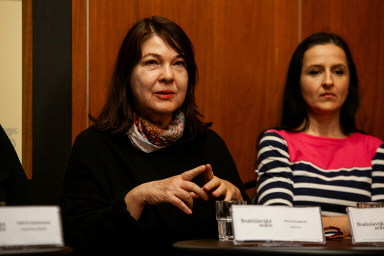Autorka Anna Grusková (vľavo) počas tlačovej konferencie po skončení verejnej generálnej skúšky inscenácie Bratislavské srdce v priestoroch Divadla Pavla Országha Hviezdoslava v Bratislave. Bratislava, 11. december 2024. Foto: SITA/Tomáš Bokor