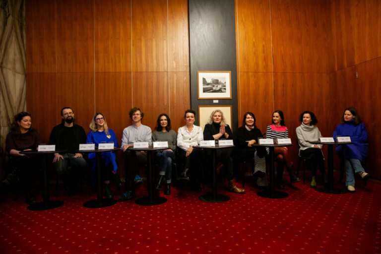 Zľava: Scénografka a kostýmová výtvarníčka Eva Kudláčová-Ráczová, herec Alexander Maďar, herečka Kristína Tormová, herec Peter Kadlečík, herečka Henrieta Mičkovicová, herečka Anikó Vargová, riaditeľka Divadla Pavla Országha Hviezdoslava Valeria Schulczová, autorka Anna Grusková, režisérka Mariana Luteránová, dramaturgička Dáša Čiripová a dramaturgička Tereza Hladká počas tlačovej konferencie po skončení verejnej generálnej skúšky inscenácie Bratislavské srdce v priestoroch Divadla Pavla Országha Hviezdoslava v Bratislave. Bratislava, 11. december 2024. Foto: SITA/Tomáš Bokor