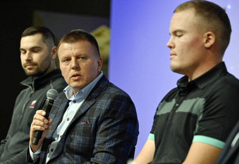 Zľava: Manažér pre reprezentáciu SKGA Matej Vajda, otec a manažér golfistu Tadeáša Teťáka Roman Teťák a golfista Tadeáš Teťák počas tlačovej konferencie Slovenskej golfovej asociácie (SKGA) v Slovenskom olympijskom a športovom múzeu na tému: Prvý odpal k olympijským hrám. Bratislava, 11. december 2024. Foto: SITA/Milan Illík