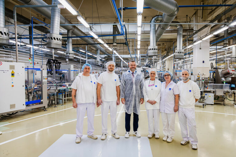 Prezident SR Peter Pellegrini (tretí zľava) počas prehliadky závodu najväčšieho slovenského výrobcu cukroviniek a trvanlivého pečiva Pečivárne Sereď spoločnosti I.D.C. Holding v Seredi. Sereď, 11. december 2024. Foto: SITA/Kancelária prezidenta SR