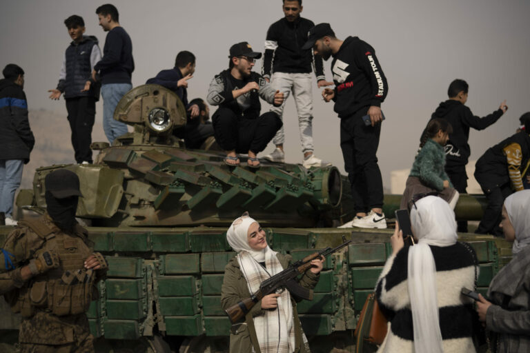 Žena držiaca pušku požičanú od bojovníka sýrskej opozície pózuje na obrázku vedľa tanku vládnych síl, ktorý zostal na ulici, na námestí Umajjov v Damasku v Sýrii, v stredu 11. decembra 2024. Foto: SITA/AP