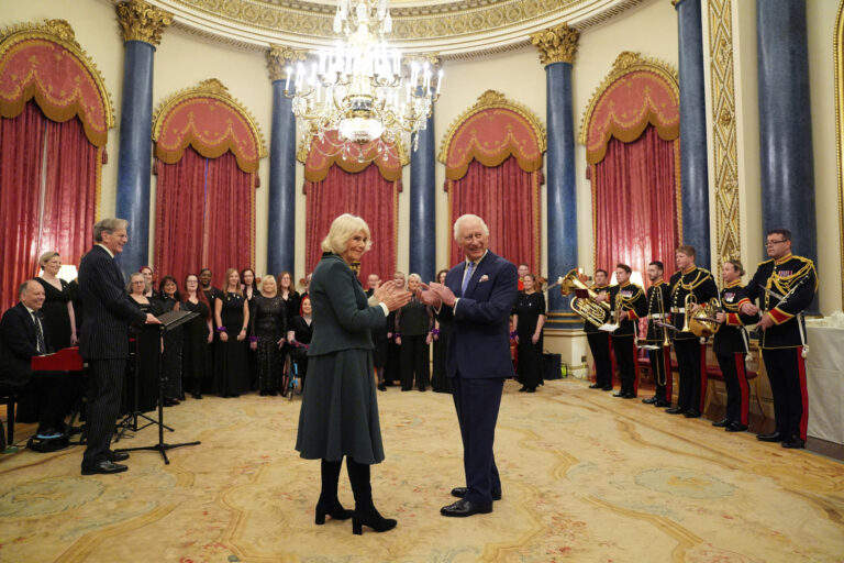 The Military Wives Choirs pod vedením Hilary Davan Wetton počas vystúpenia pre kráľa Karola III. a kráľovnú Camillu v Buckinghamskom paláci v Londýne, v stredu 11. decembra 2024. Foto: Yui Mok/Pool via AP
