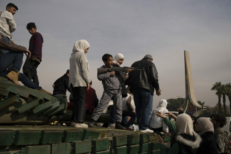 Chlapec držiaci pušku od bojovníka sýrskej opozície na vrchu tanku vládnych síl, ktorý zostal na ulici, na námestí Umajjov v Damasku v Sýrii, v stredu 11. decembra 2024. Foto: SITA/AP