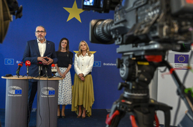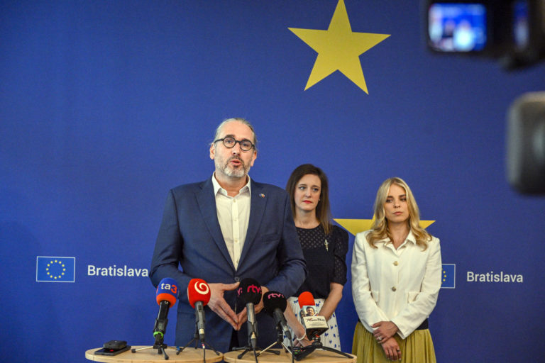 Zľava: Zvolení europslanci do Európskeho parlamentu (EP) Martin Hojsík, Ľubica Karvašová a Veronika Cifrová Ostrihoňová počas tlačovej besedy a neformálneho stretnutia s europoslancami pred prvou plenárnou schôdzou EP v Štrasburgu na tému: Predstavenie základných priorít na nasledujúcich päť rokov, vrátane tém prvého plenárneho zasadnutia v Dome Európskej únie v Bratislave. Bratislava, 11. júl 2024. Foto: SITA/Milan Illík