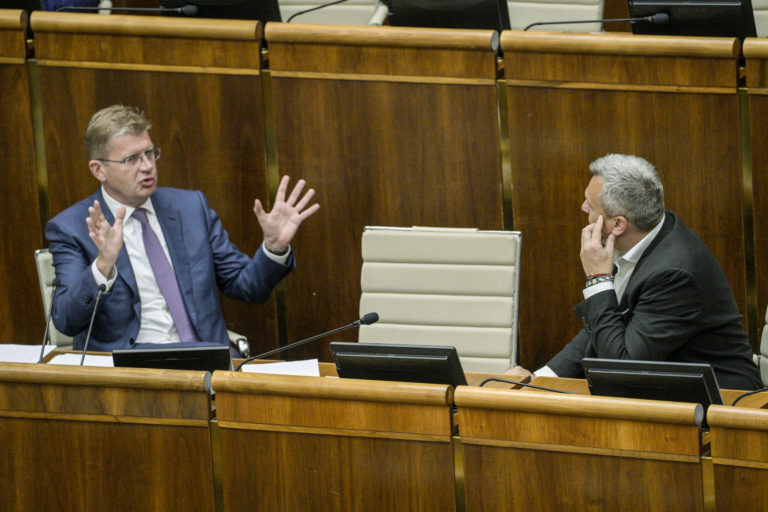 Zľava: Podpredseda parlamentu a poverený predseda NR SR Peter Žiga a podpredseda NR SR za stranu SNS Andrej Danko počas rokovania 15. schôdze Národnej rady SR. Bratislava, 11. jún 2024. Foto: SITA/Milan Illík