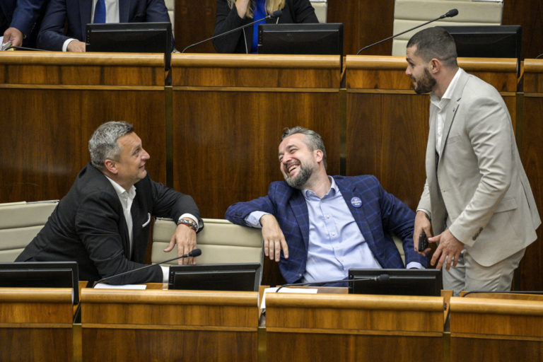 Sprava: Poslanec za za stranu SMER-SD Richard Glück, podpredseda NR SR za stranu SMER-SD Ľuboš Blaha a podpredseda NR SR za stranu SNS Andrej Danko počas rokovania 15. schôdze Národnej rady SR. Bratislava, 11. jún 2024. Foto: SITA/Milan Illík