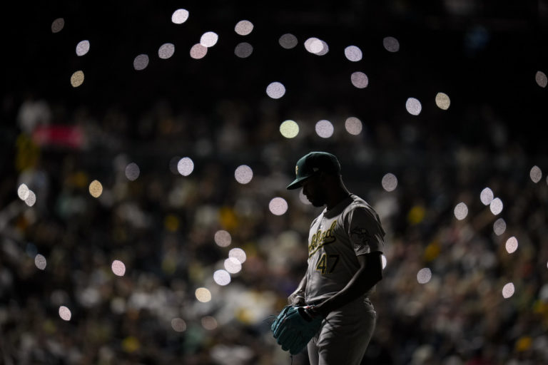 Nadhadzovač Oakland Athletics Michel Otanez čaká na nadhod, kým fanúšikovia držia svetlá z telefónov počas poruchy osvetlenia na štadióne v siedmej zmene baseballového zápasu proti San Diegu Padres, pondelok 10. júna 2024 v San Diegu. Foto: SITA/AP