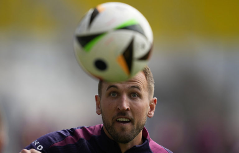 Anglický futbalista Harry Kane si ide po loptu počas verejného tréningu na štadióne v Jene v Nemecku v utorok 11. júna 2024 pred zápasom skupiny C proti Srbsku na futbalovom turnaji Euro 2024. Foto: SITA/AP