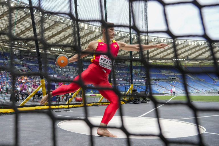 Čiernohorský atlét Darko Pešič súťaží naboso v hode diskom v desaťboji mužov na majstrovstvách Európy v atletike v Ríme v utorok 11. júna 2024. Foto: SITA/AP