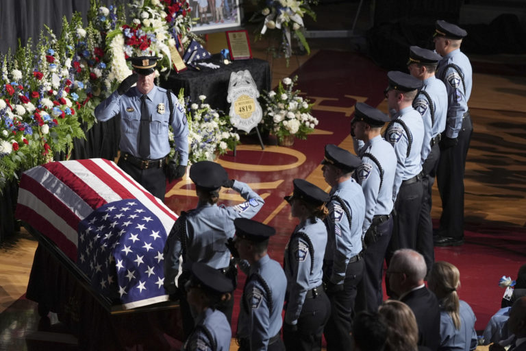 Príslušníci orgánov činných v trestnom konaní vzdávajú poctu počas verejnej spomienkovej slávnosti na policajného dôstojníka Jamala Mitchella v Maple Grove Senior High School v utorok 11. júna 2024 v Maple Grove, Minn. Mitchell bol zastrelený pri zásahu pri streľbe 30. mája 2024. Foto: SITA/AP