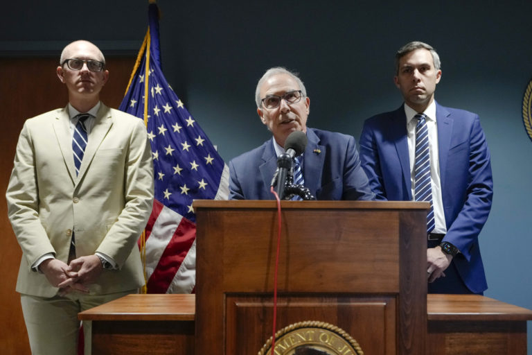 Osobitný poradca ministerstva spravodlivosti David Weiss (uprostred) v sprievode federálnych prokurátorov Dereka Hinesa (vpravo) a Lea Wisea hovorí počas tlačovej konferencie v utorok 11. júna 2024 vo Wilmingtone, štát Del. Foto: SITA/AP