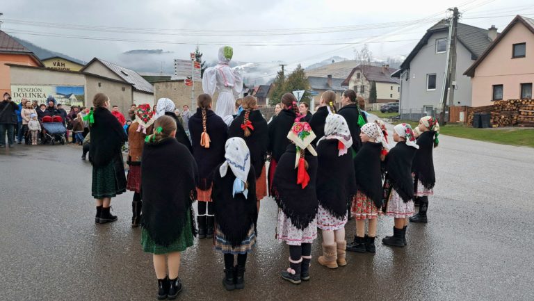 Sprievod podtatranskou obcou Liptovská Teplička počas vynášania Moreny, ktorým sa tam symbolicky snažia odohnať zimu a privolať jar. Liptovská Teplička, 11. marec 2024. Foto: SITA/Mária Frisová.
