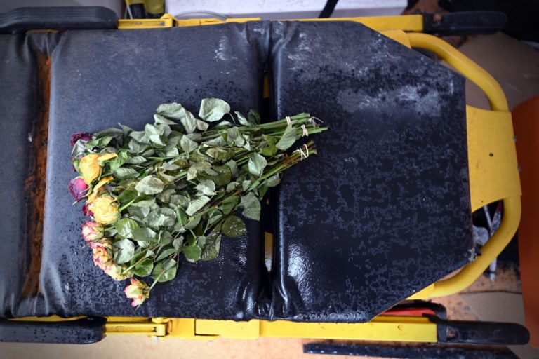 Interiér sanitky ukrajinskej záchrannej služby po útoku ruskej armády v meste Charkov v rámci výstavy "Dôsledky ruskej agresie na Námestí Slobody v Banskej Bystrici. Banská Bystrica, 11. marec 2024. Foto: SITA/Jakub Julény