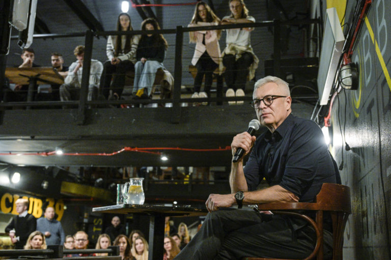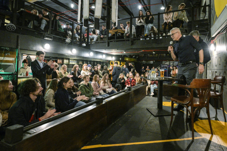 Občianský kandidát na prezidenta SR Ivan Korčok (vpravo) počas diskusie so študentmi v Mlynskej doline v Bratislave. Bratislava, 11. marec 2024. Foto: SITA/Milan Illík