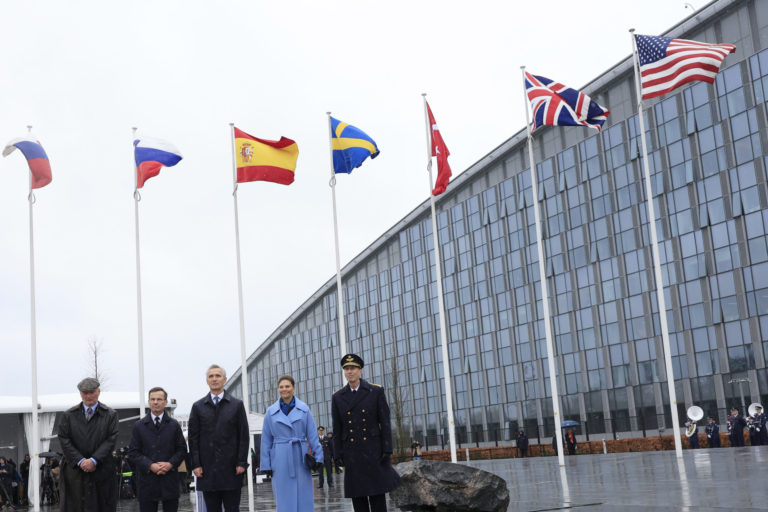 Druhý zľava švédsky premiér Ulf Kristersson, generálny tajomník NATO Jens Stoltenberg a švédska korunná princezná Victoria pózujú pred vlajkou Švédska a ďalších krajín aliancie po ceremónii pri príležitosti vstupu Švédska do NATO v sídle NATO v Bruseli. Foto: SITA/AP