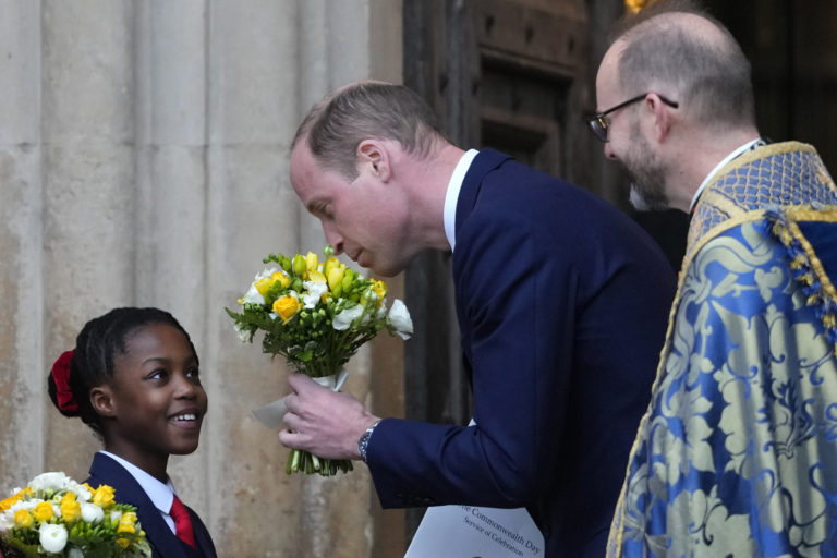 Britský princ William vonia kyticu kvetov po odchode z oslavy na počesť Kráľovstva spoločenstva (Deň Commonwealthu) vo Westminsterskom opátstve v Londýne. Foto: SITA/AP